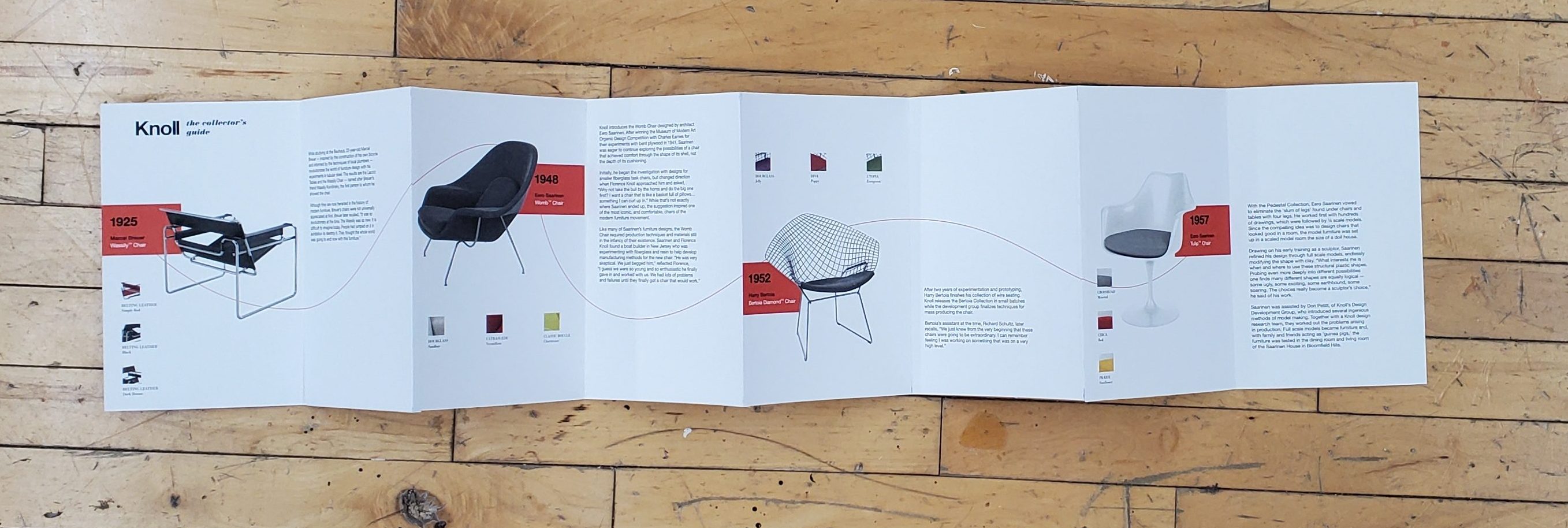 The Knoll Collector’s Guide was created in 2021 as a hypothetical guide for Knoll enthusiasts to find the best chairs. Features Marcel Breuer’s Wassily chair, Eero Saarinen’s Womb chair, Harry Bertoia’s Diamond chair, and Eero Saarinin’s Tulip chair.